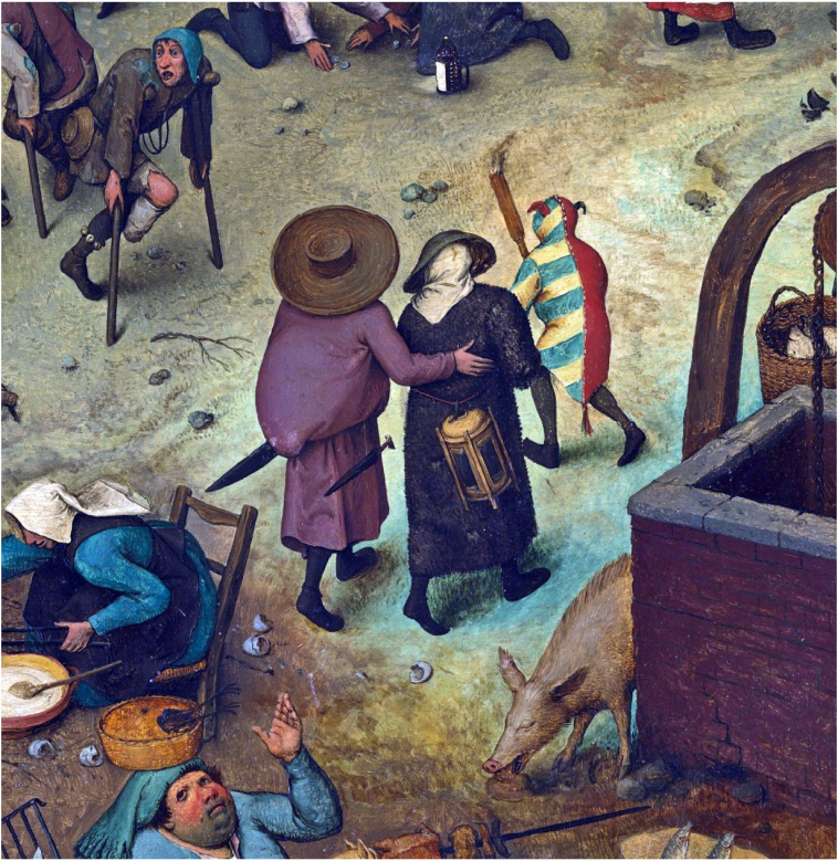 В центре «Битвы Масленицы и Поста» Брейгеля изображена супружеская пара. Мужчина несет мешок — символ эгоизма и несовершенства, а женщина — погашенный фонарь, отражающий недостаток мудрости. Поддерживая друг друга, они удаляются в сопровождении шута. Мы интерпретируем эти фигуры как сообщение в поддержку будущего Реформации. Хотя простые мужчина и женщина не такие просвещенные, как того желали бы интеллектуалы, они, как правило, не участвуют в войне фанатиков. Эта невовлеченность не следствие общей апатии, а скорее выражение прагматичного желания спокойной семейной жизни и индивидуального экономического прогресса.