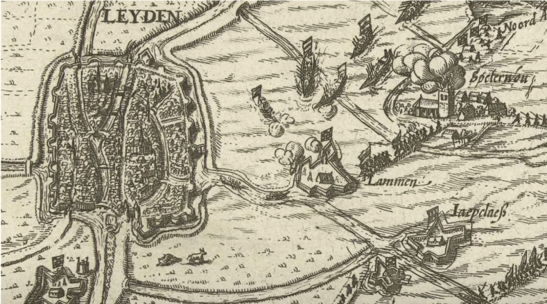 «Снятие осады Лейдена», 1574 (фрагмент). Затопление полей путем разрушения плотин нанесло огромный ущерб, но ослабило испанскую армию и позволило нидерландской флотилии достичь города.