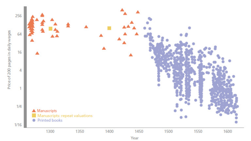 В Европе XV века «цена книг падала на 2,4% в год на протяжении более ста лет», в то время как доля университетских курсов, посвященных науке, выросла с 25% до 40%. (Dittmar & Seabold)