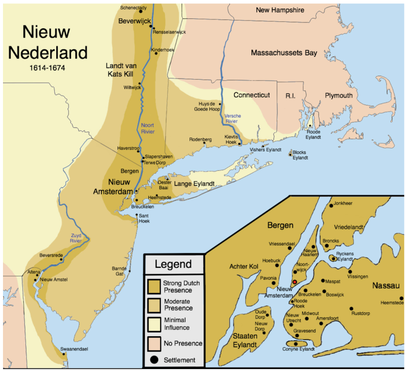 Карта Новых Нидерландов. Большинство нидерландских поселений находились на территории современного Нью-Йорка