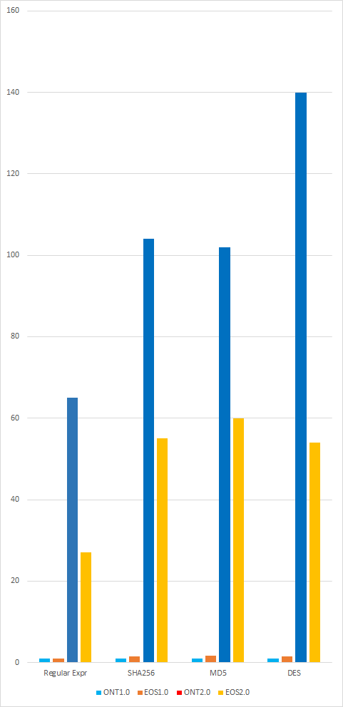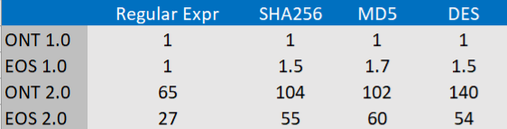 В таблице ниже приведены результаты одного и того же теста среды на виртуальных машинах с открытым исходным кодом Ontology и EOS. Поскольку EOS не платит за газ, этот тест основан на версии Ontology Wasm-JIT без платы за газ.