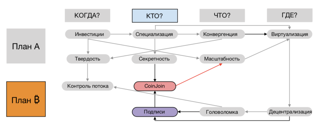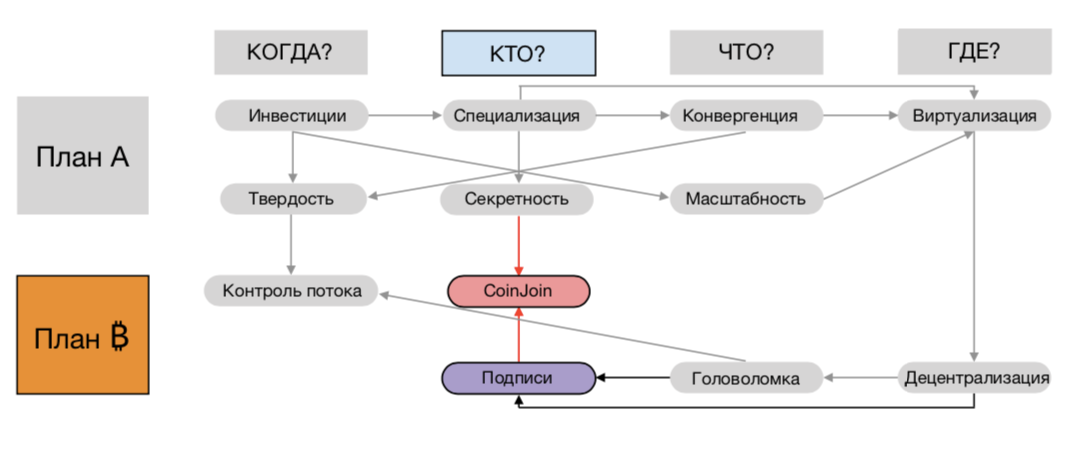 • использование более сложной парадигмы под названием CoinJoin позволяет повысить секретность и масштабность сети.