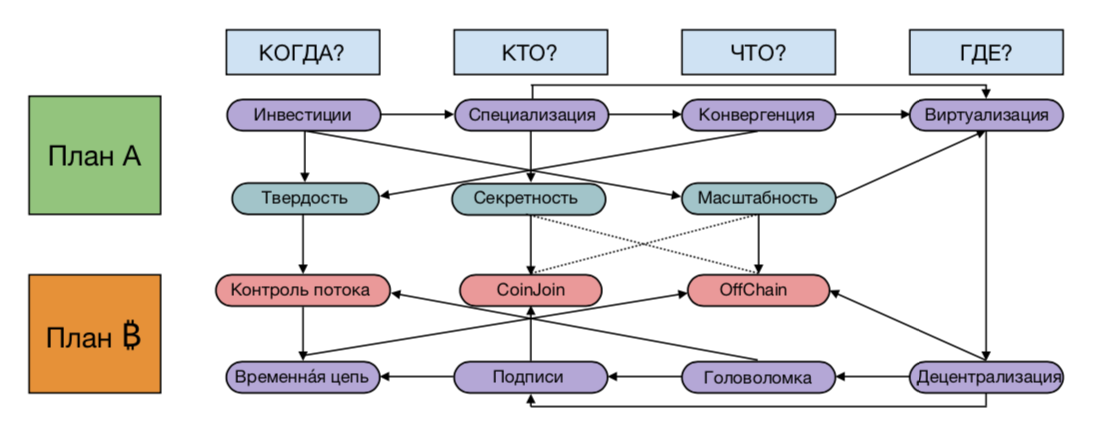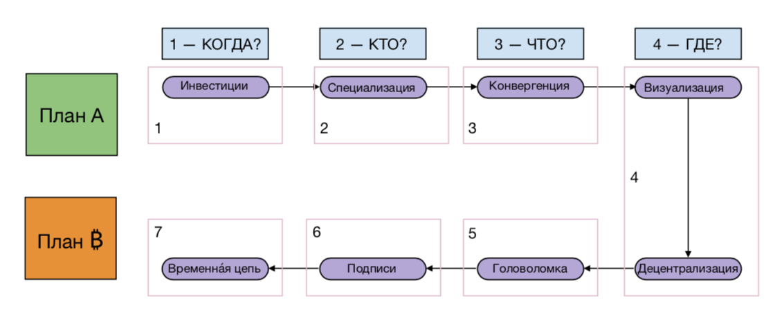 Вторая часть называется “План ₿” (да, как вы уже догадались: “₿” означает Биткоин): Все начинается с неприятной ситуации, в которой мы по вине Плана А оказались на пути к гениальному открытию Биткоина. Часть “Где?” — это мост (и переломный момент) между двумя моделями. Нечто подобное: